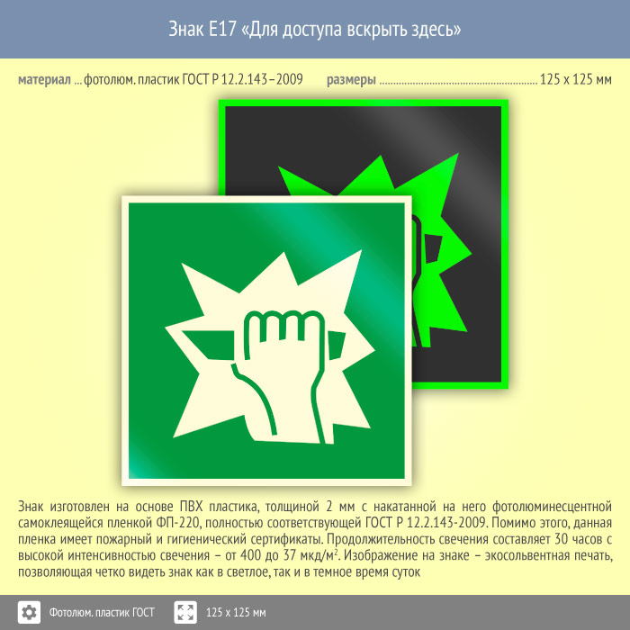 Знак E17 «Для доступа вскрыть здесь» (фотолюминесцентный пластик ГОСТ 34428-2018, 125х125 мм) в Курске купить