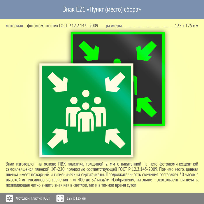 Знак E21 «Пункт (место) сбора» (фотолюминесцентный пластик ГОСТ 34428-2018, 125х125 мм) в Курске купить