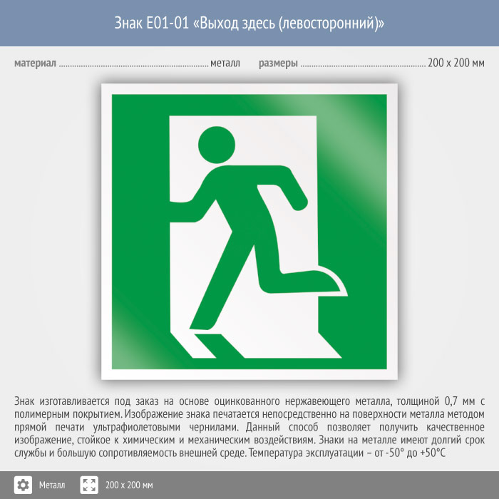 Знак E01-01 «Выход здесь (левосторонний)» (металл, 200х200 мм) в Курске купить