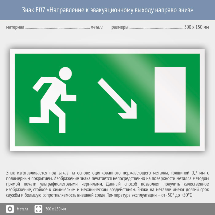 Знак E07 «Направление к эвакуационному выходу направо вниз» (металл, 300х150 мм) в Курске купить