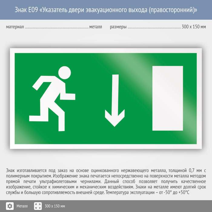 Знак E09 «Указатель двери эвакуационного выхода (правосторонний)» (металл, 300х150 мм) в Курске купить