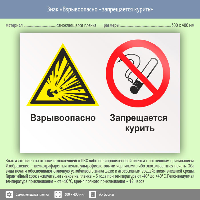 Знак «Взрывоопасно - запрещается курить», КЗ-06 (пленка, 400х300 мм) в Курске купить