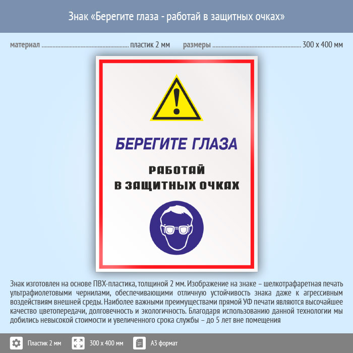 Знак «Берегите глаза - работай в защитных очках», КЗ-04 (пластик, 300х400 мм) в Курске купить