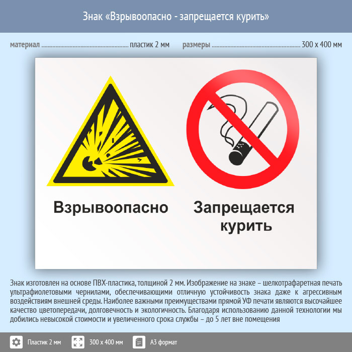 Знак «Взрывоопасно - запрещается курить», КЗ-06 (пластик, 400х300 мм) в Курске купить