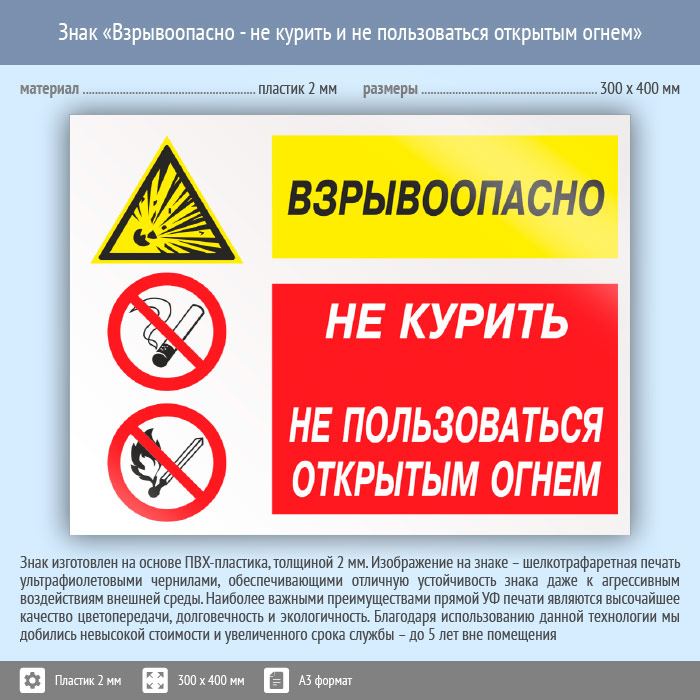 Знак «Взрывоопасно - не курить и не пользоваться открытым огнем», КЗ-09 (пластик, 400х300 мм) в Курске купить