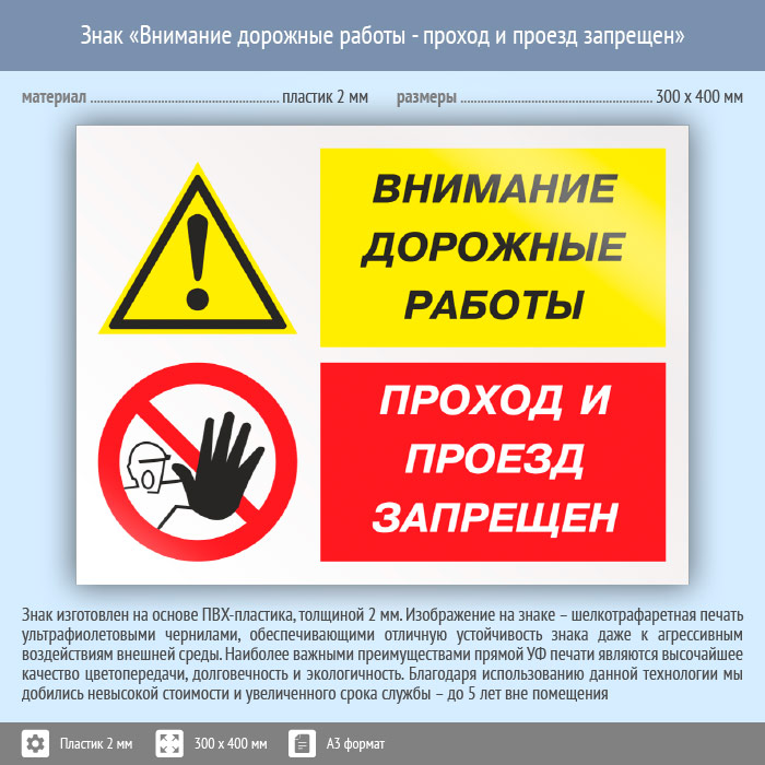 Знак «Внимание дорожные работы - проход и проезд запрещен», КЗ-14 (пластик, 400х300 мм) в Курске купить