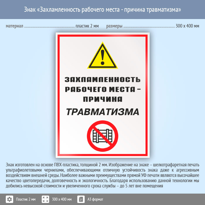 Знак «Захламленность рабочего места - причина травматизма», КЗ-21 (пластик, 300х400 мм) в Курске купить