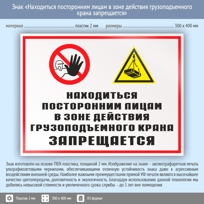 Знак «Находиться посторонним лицам в зоне действия грузоподъемного крана запрещается», КЗ-23 (пластик, 400х300 мм) в Курске купить