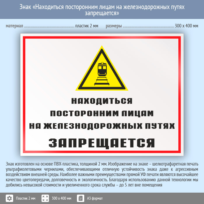 Знак «Находиться посторонним лицам на железнодорожных путях запрещается», КЗ-24 (пластик, 400х300 мм) в Курске купить