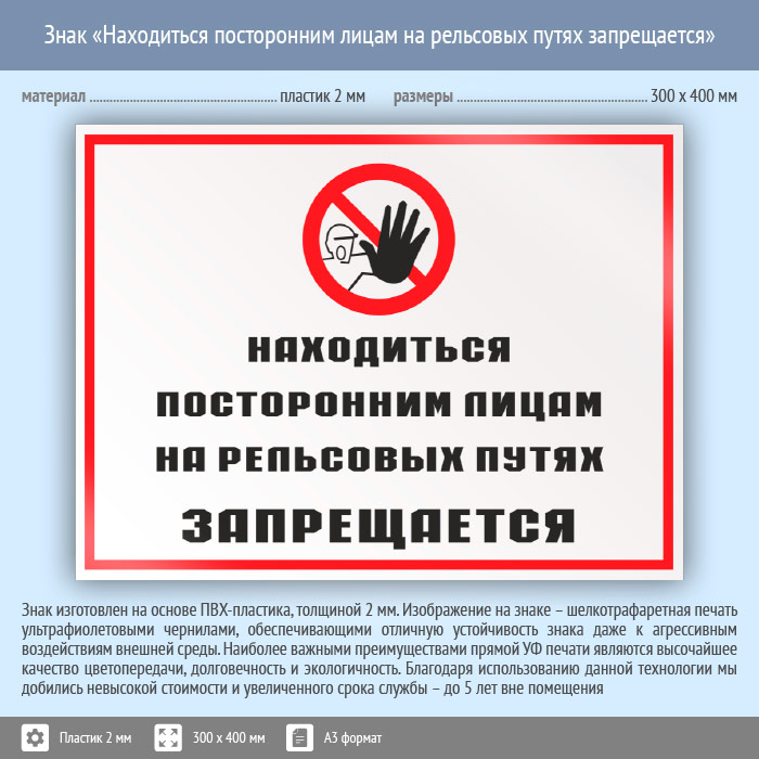 Знак «Находиться посторонним лицам на рельсовых путях запрещается», КЗ-25 (пластик, 400х300 мм) в Курске купить