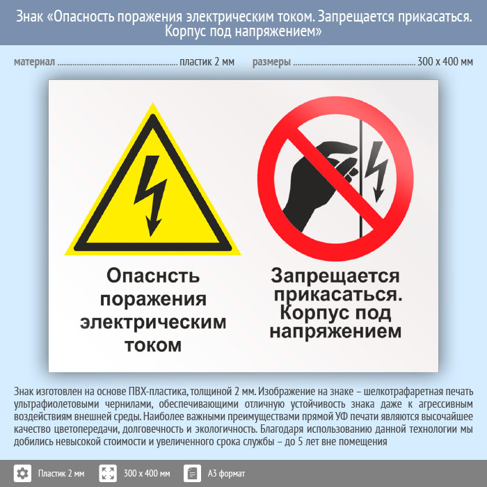 Знак «Опасность поражения электрическим током. Запрещается прикасаться. Корпус под напряжением», КЗ-47 (пластик, 400х300 мм) в Курске купить