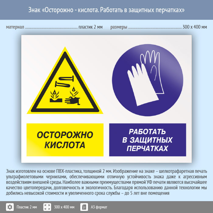 Знак «Осторожно - кислота. Работать в защитных перчатках», КЗ-56 (пластик, 400х300 мм) в Курске купить