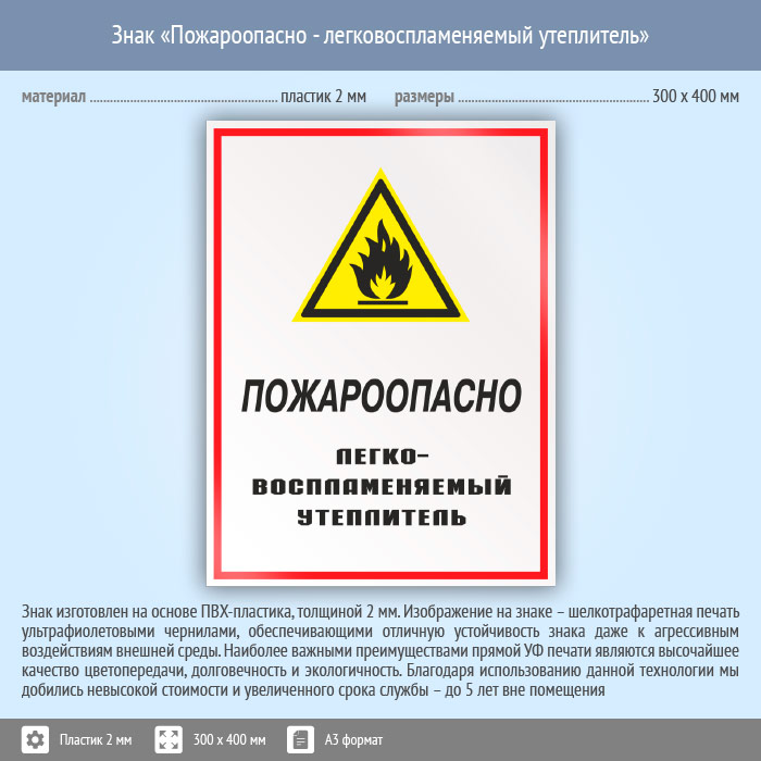 Знак «Пожароопасно - легковоспламеняемый утеплитель», КЗ-68 (пластик, 300х400 мм) в Курске купить