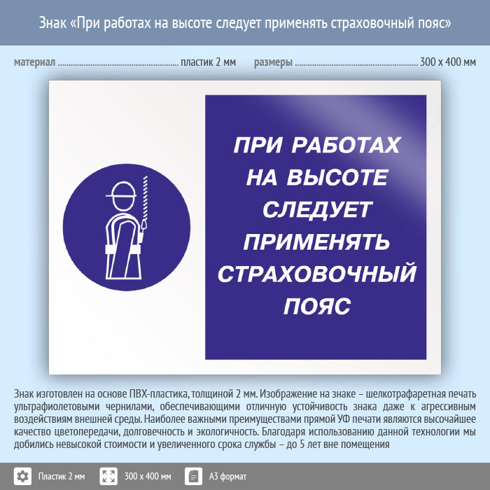 Знак «При работах на высоте следует применять страховочный пояс», КЗ-75 (пластик, 400х300 мм) в Курске купить