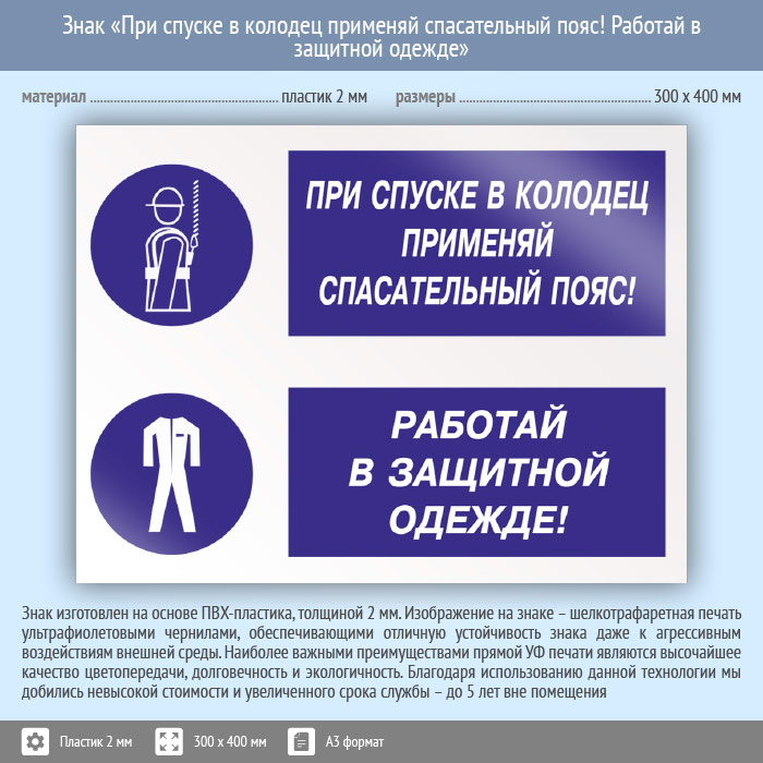 Знак «При спуске в колодец применяй спасательный пояс! Работай в защитной одежде», КЗ-76 (пластик, 400х300 мм) в Курске купить