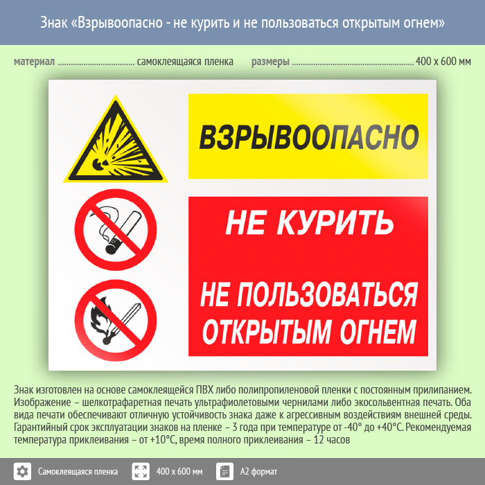 Знак «Взрывоопасно - не курить и не пользоваться открытым огнем», КЗ-09 (пленка, 600х400 мм) в Курске купить
