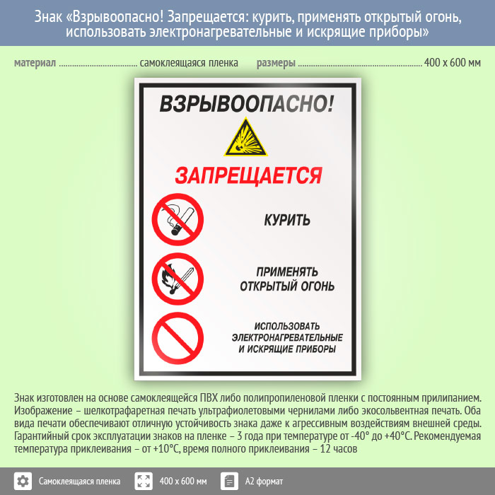 Знак «Взрывоопасно! Запрещается: курить, применять открытый огонь, использовать электронагревательные и искрящие приборы», КЗ-10 (пленка, 400х600 мм) в Курске купить