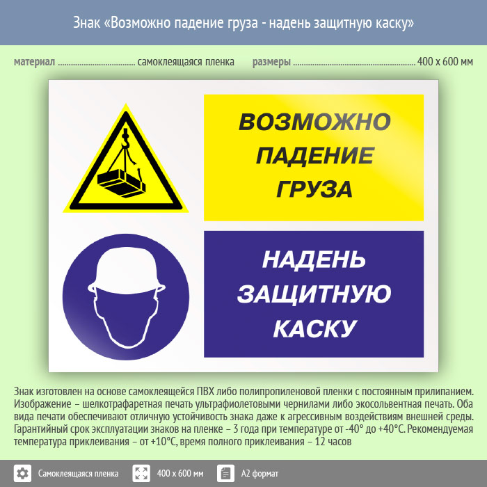 Знак «Возможно падение груза - надень защитную каску», КЗ-17 (пленка, 600х400 мм) в Курске купить