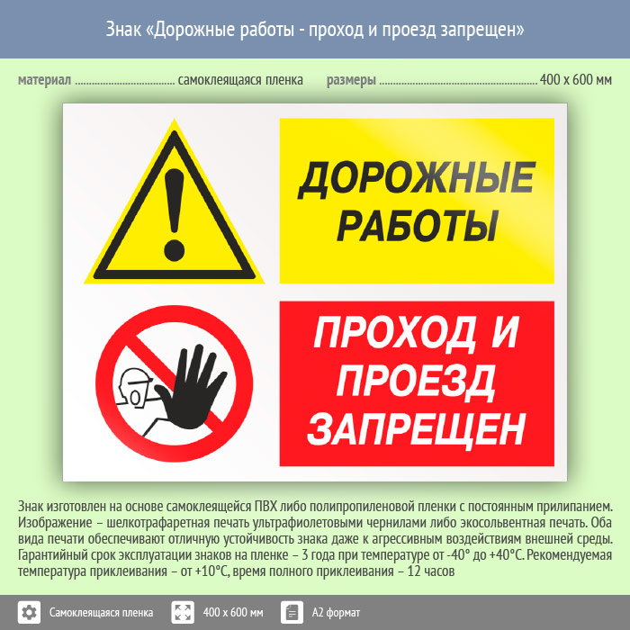 Знак «Дорожные работы - проход и проезд запрещен», КЗ-20 (пленка, 600х400 мм) в Курске купить