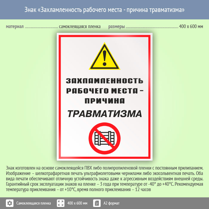 Знак «Захламленность рабочего места - причина травматизма», КЗ-21 (пленка, 400х600 мм) в Курске купить