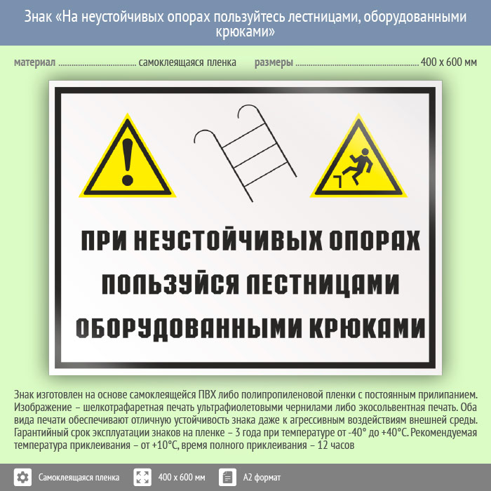 Знак «На неустойчивых опорах пользуйтесь лестницами, оборудованными крюками», КЗ-22 (пленка, 600х400 мм) в Курске купить