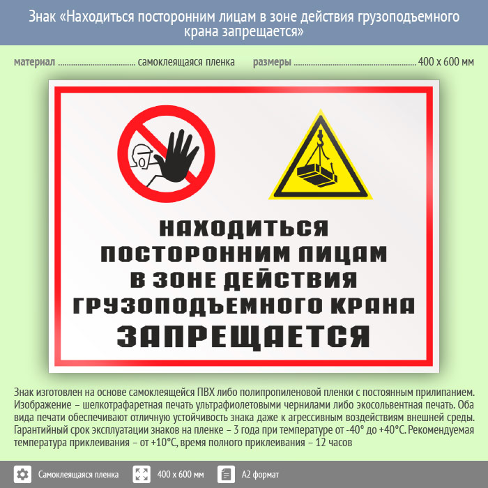 Знак «Находиться посторонним лицам в зоне действия грузоподъемного крана запрещается», КЗ-23 (пленка, 600х400 мм) в Курске купить