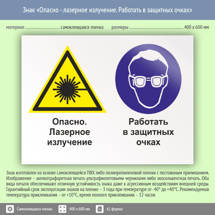 Знак «Опасно - лазерное излучение. Работать в защитных очках», КЗ-38 (пленка, 600х400 мм) в Курске купить