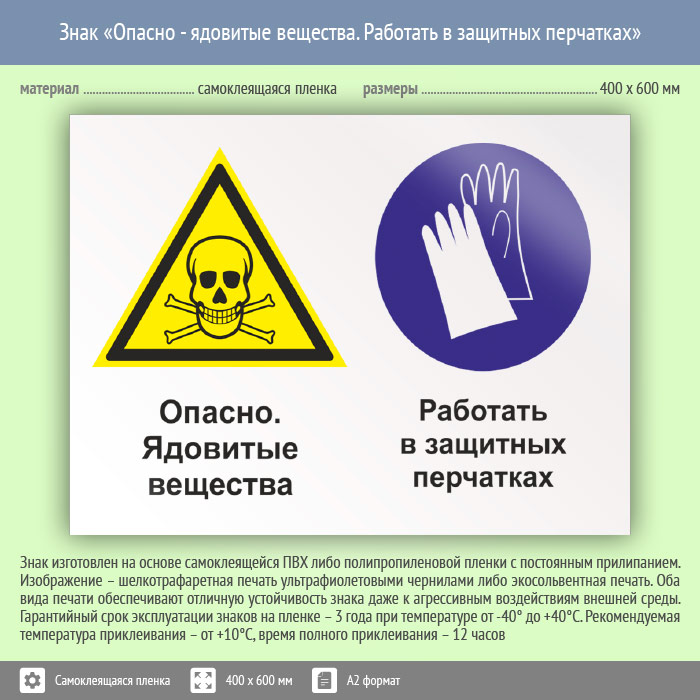 Знак «Опасно - ядовитые вещества. Работать в защитных перчатках», КЗ-43 (пленка, 600х400 мм) в Курске купить