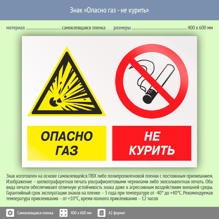 Знак «Опасно газ - не курить», КЗ-44 (пленка, 600х400 мм) в Курске купить