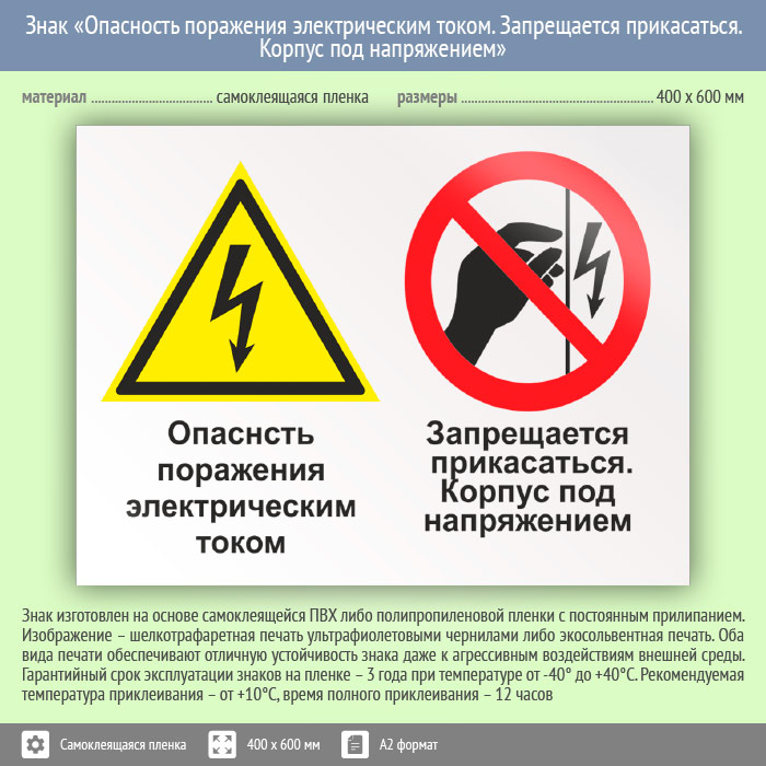 Знак «Опасность поражения электрическим током. Запрещается прикасаться. Корпус под напряжением», КЗ-47 (пленка, 600х400 мм) в Курске купить