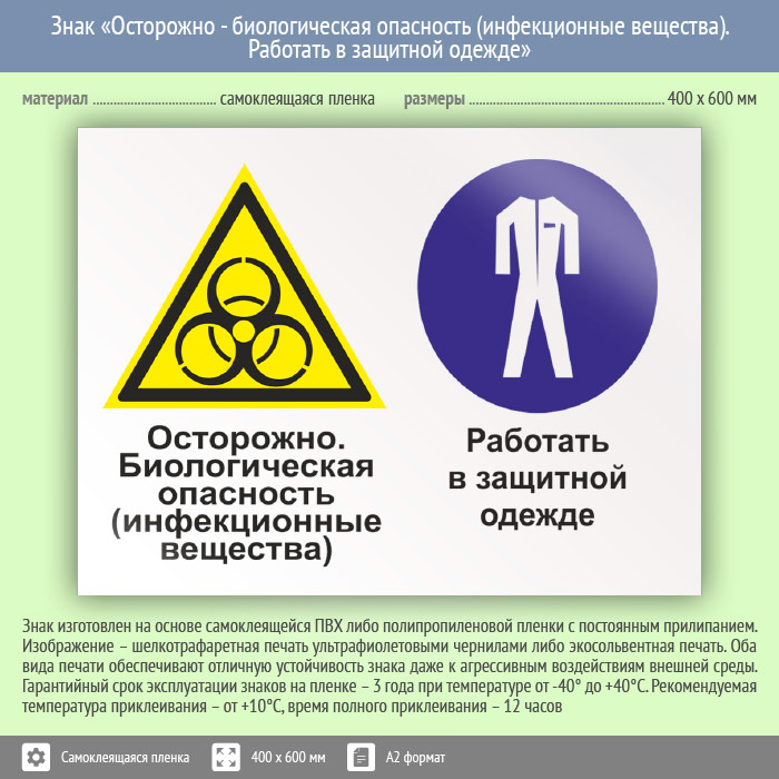 Знак «Осторожно - биологическая опасность (инфекционные вещества). Работать в защитной одежде», КЗ-53 (пленка, 600х400 мм) в Курске купить