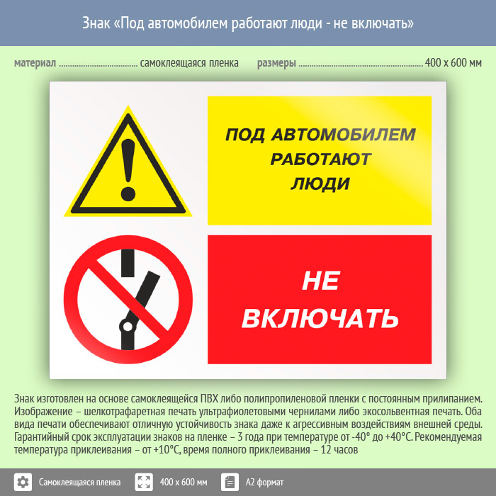 Знак «Под автомобилем работают люди - не включать», КЗ-65 (пленка, 600х400 мм) в Курске купить
