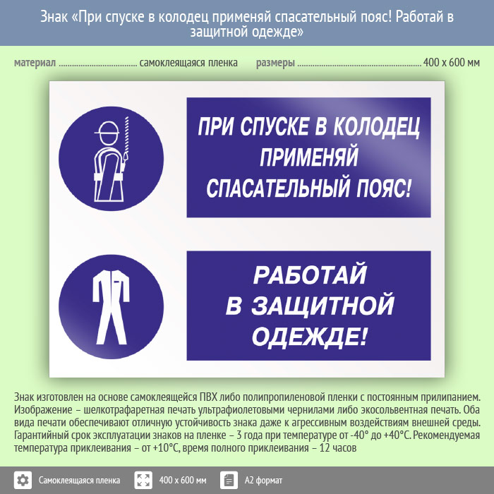 Знак «При спуске в колодец применяй спасательный пояс! Работай в защитной одежде», КЗ-76 (пленка, 600х400 мм) в Курске купить