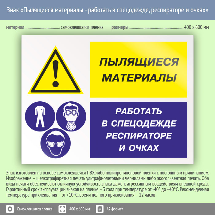 Знак «Пылящиеся материалы - работать в спецодежде, респираторе и очках», КЗ-79 (пленка, 600х400 мм) в Курске купить