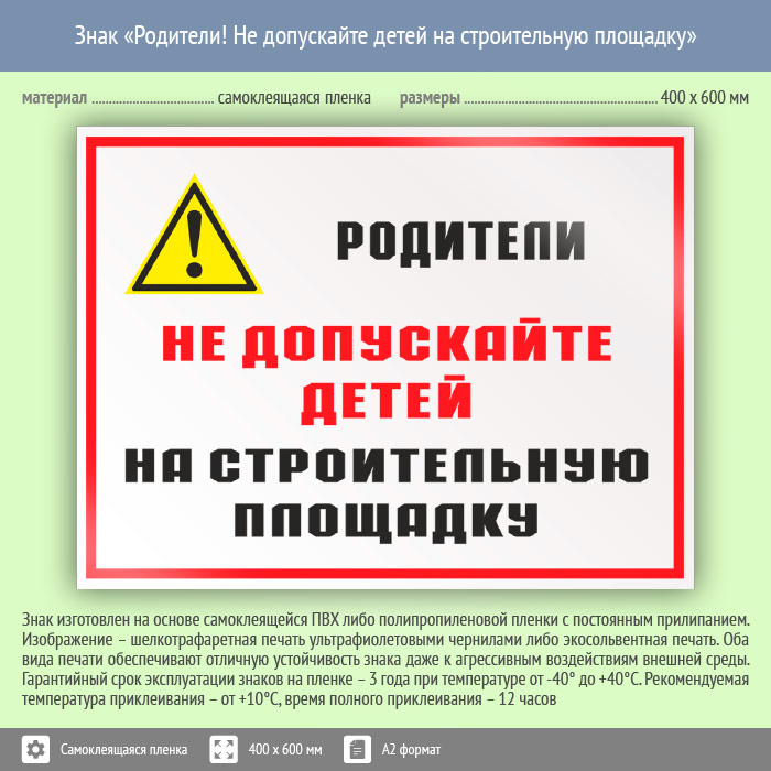 Знак «Родители! Не допускайте детей на строительную площадку», КЗ-84 (пленка, 600х400 мм) в Курске купить