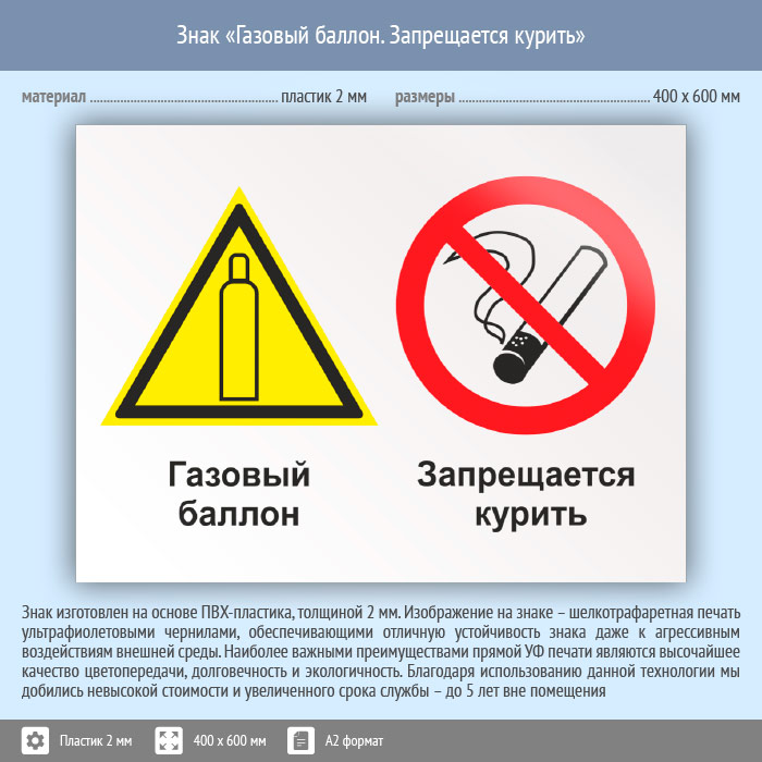 Знак «Газовый баллон. Запрещается курить», КЗ-18 (пластик, 600х400 мм) в Курске купить