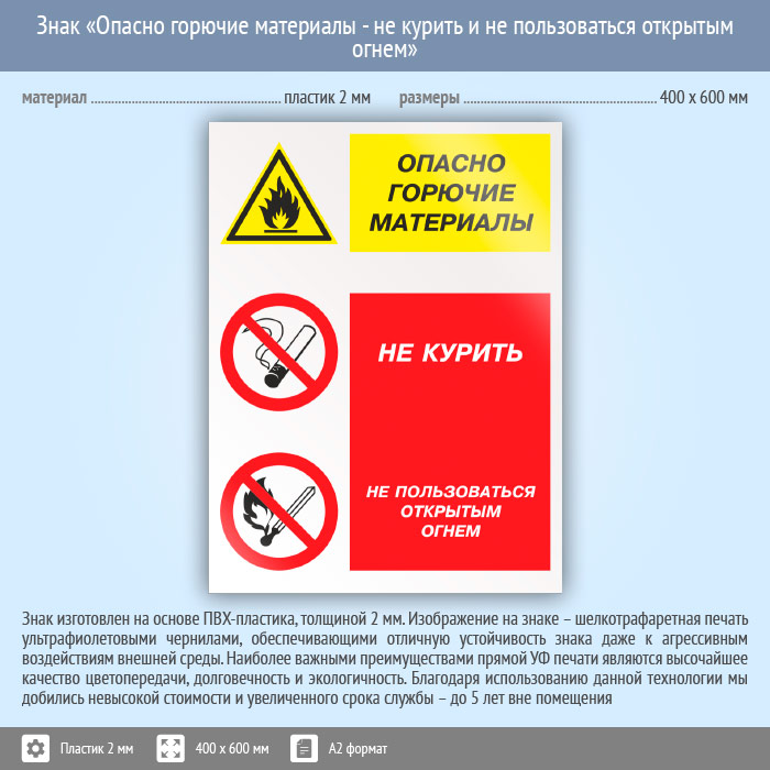 Знак «Опасно горючие материалы - не курить и не пользоваться открытым огнем», КЗ-45 (пластик, 400х600 мм) в Курске купить