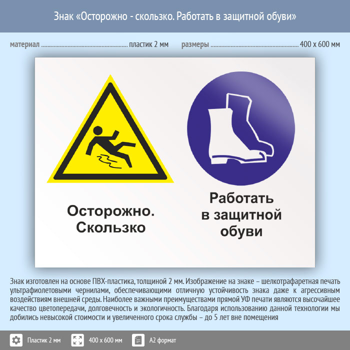 Знак «Осторожно - скользко. Работать в защитной обуви», КЗ-57 (пластик, 600х400 мм) в Курске купить
