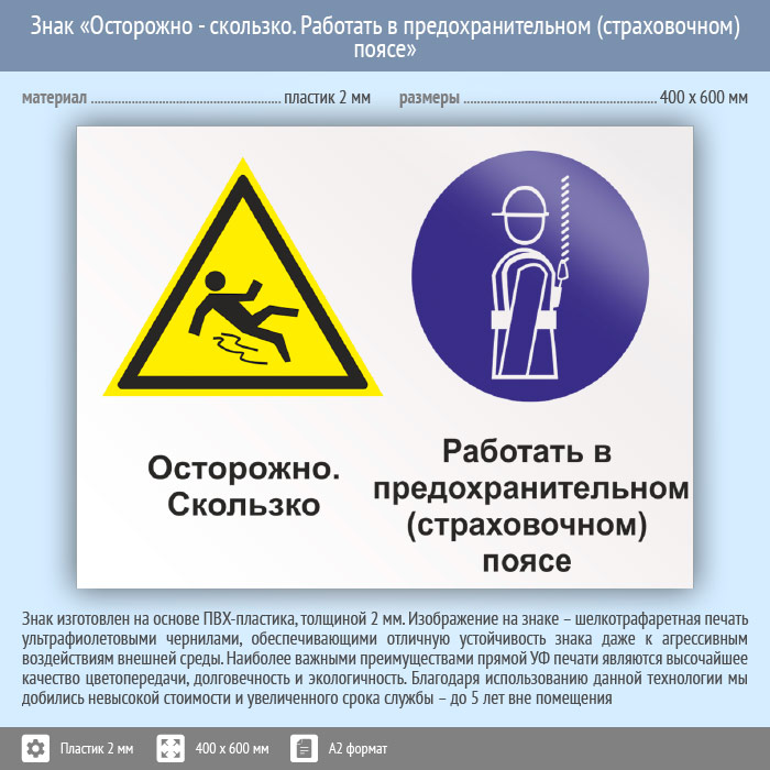 Знак «Осторожно - скользко. Работать в предохранительном (страховочном) поясе», КЗ-58 (пластик, 600х400 мм) в Курске купить
