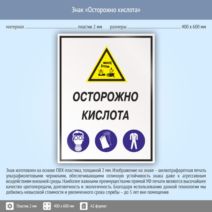 Знак «Осторожно кислота», КЗ-61 (пластик, 400х600 мм) в Курске купить