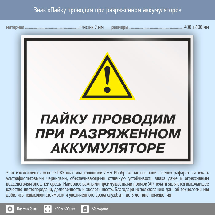 Знак «Пайку проводим при разряженном аккумуляторе», КЗ-62 (пластик, 600х400 мм) в Курске купить