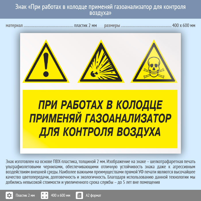 Знак «При работах в колодце применяй газоанализатор для контроля воздуха», КЗ-74 (пластик, 600х400 мм) в Курске купить