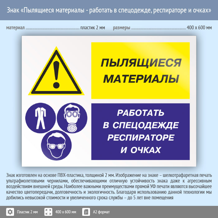 Знак «Пылящиеся материалы - работать в спецодежде, респираторе и очках», КЗ-79 (пластик, 600х400 мм) в Курске купить