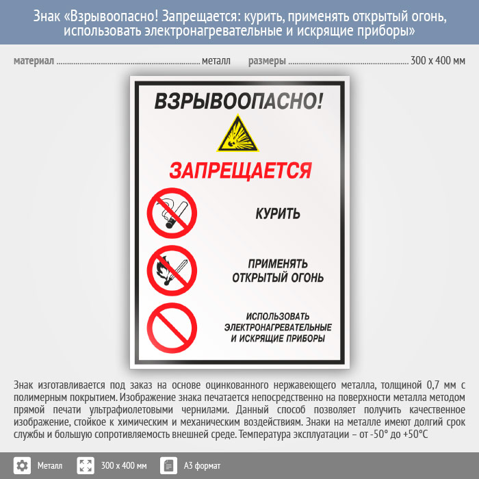 Знак «Взрывоопасно! Запрещается: курить, применять открытый огонь, использовать электронагревательные и искрящие приборы», КЗ-10 (металл, 300х400 мм) в Курске купить