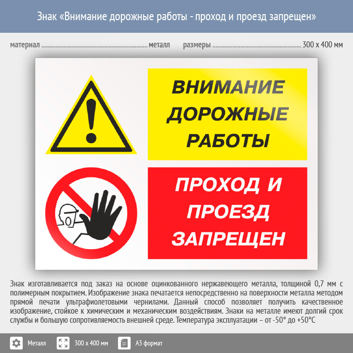 Знак «Внимание дорожные работы - проход и проезд запрещен», КЗ-14 (металл, 400х300 мм) в Курске купить