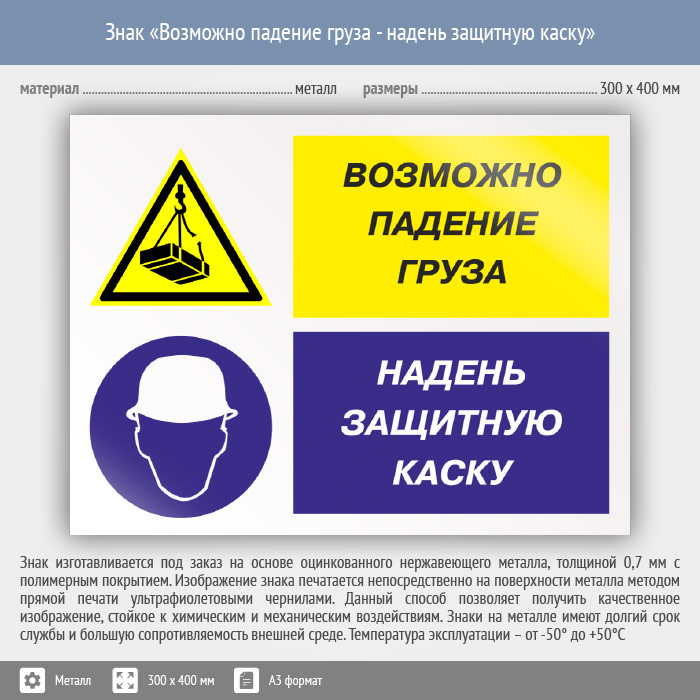 Знак «Возможно падение груза - надень защитную каску», КЗ-17 (металл, 400х300 мм) в Курске купить