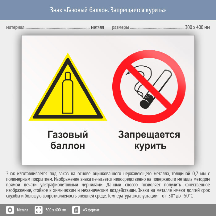 Знак «Газовый баллон. Запрещается курить», КЗ-18 (металл, 400х300 мм) в Курске купить