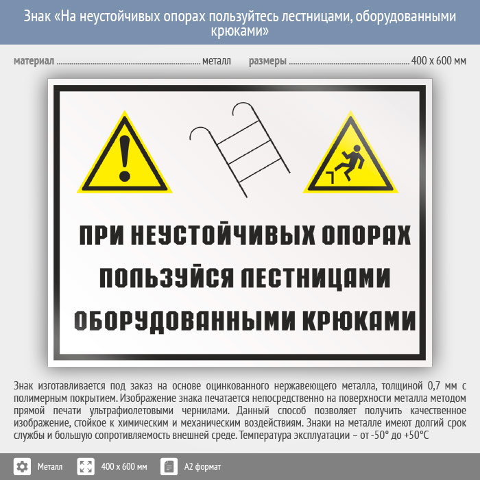 Знак «На неустойчивых опорах пользуйтесь лестницами, оборудованными крюками», КЗ-22 (металл, 600х400 мм) в Курске купить