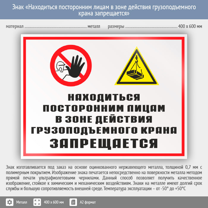 Знак «Находиться посторонним лицам в зоне действия грузоподъемного крана запрещается», КЗ-23 (металл, 600х400 мм) в Курске купить