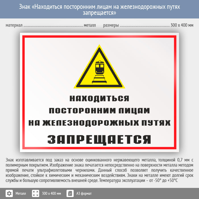 Знак «Находиться посторонним лицам на железнодорожных путях запрещается», КЗ-24 (металл, 400х300 мм) в Курске купить